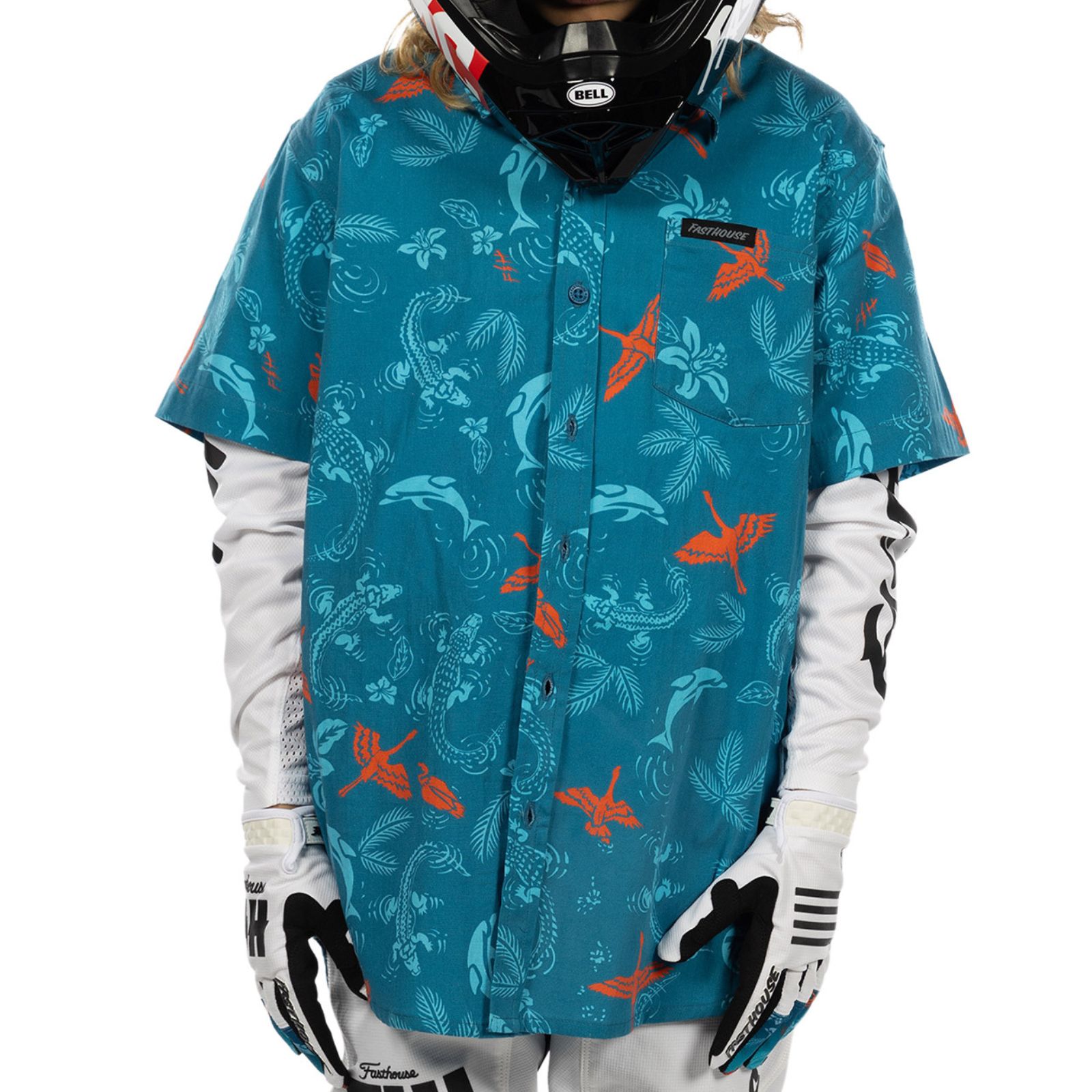 Youth island-inspired button-up with stretch poplin comfort and all-over print design.