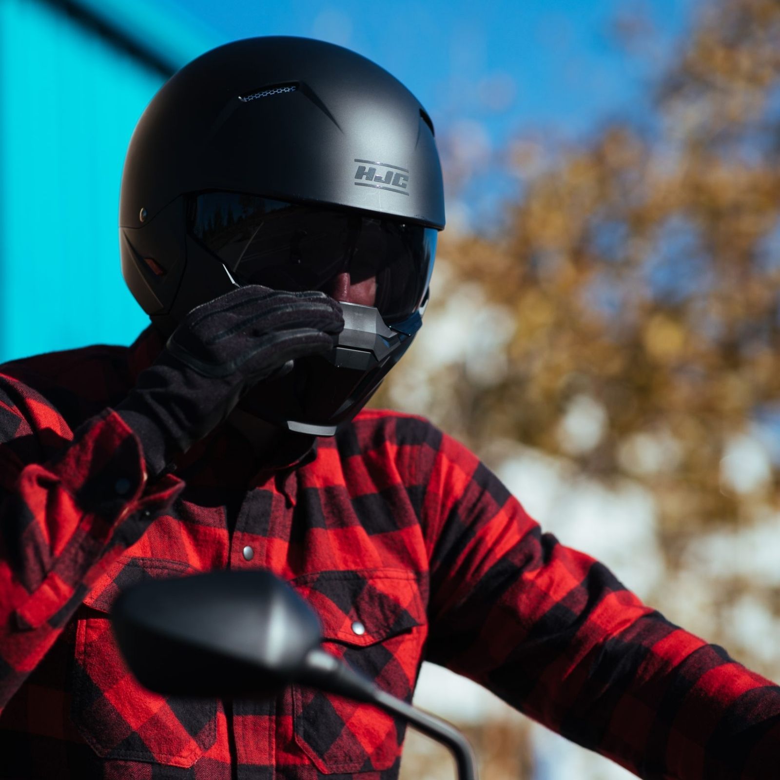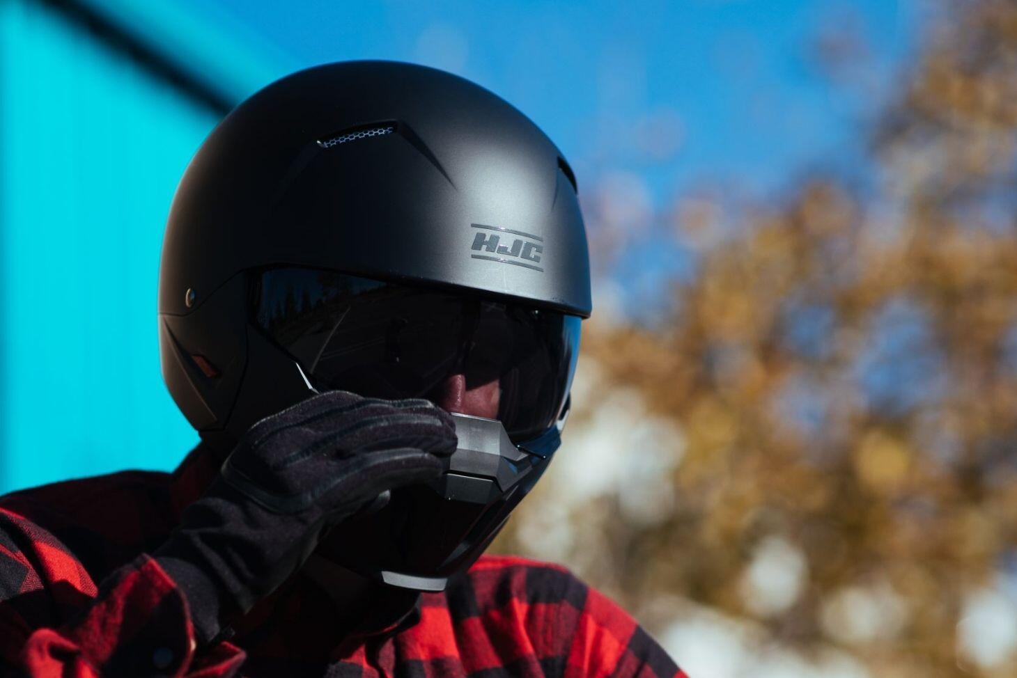 Street fighter open-face helmet with removable mask, anti-fog visor, lightweight shell and Smart HJC Bluetooth readiness.