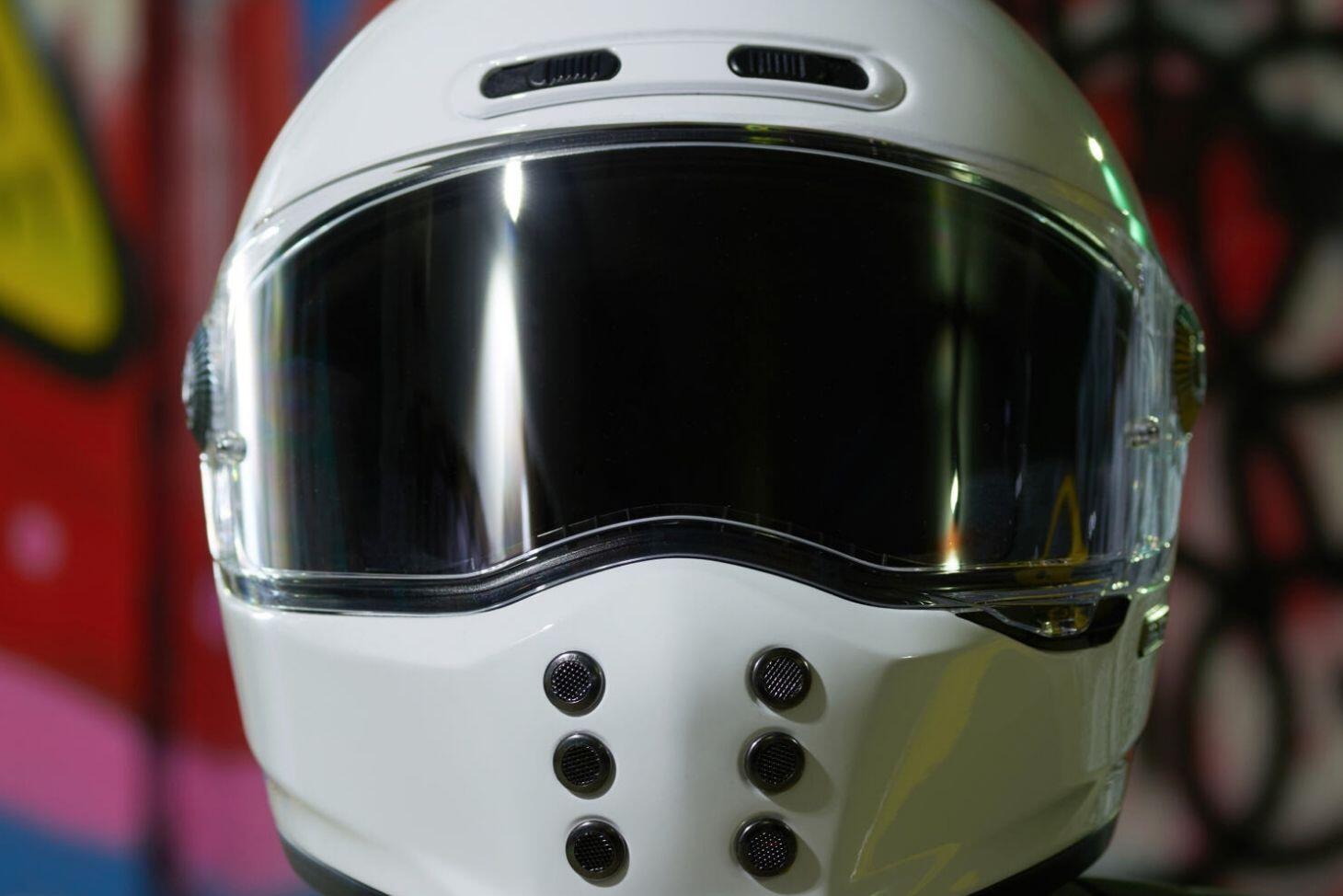 The V10 helmet redefines the vintage aesthetic with modern features including a lightweight fiberglass shell, aerodynamic design, and emergency safety tabs. It also offers a washable interior, easy shield replacement, and is Bluetooth-compatible with SMART HJC for enhanced connectivity.