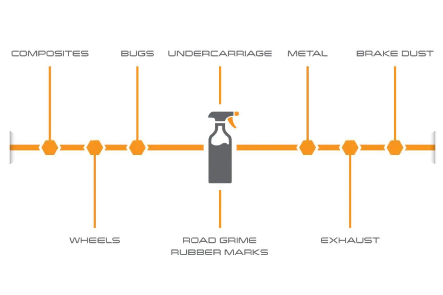 An easy to use, spray on, wipe off, heavy duty cleaner. Specifically formulated to quickly and safely remove heavy soils, dirt, oil, rubber scuff marks, bugs and all other type of competition grime. Can be used on paint, vinyl wraps, stickers, wheels, chrome, plastic and metal surfaces. Use it on anything you need to clean.