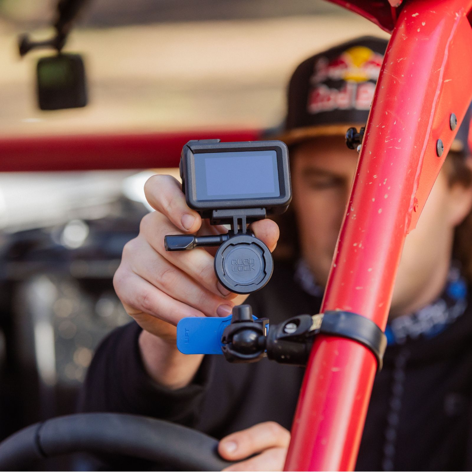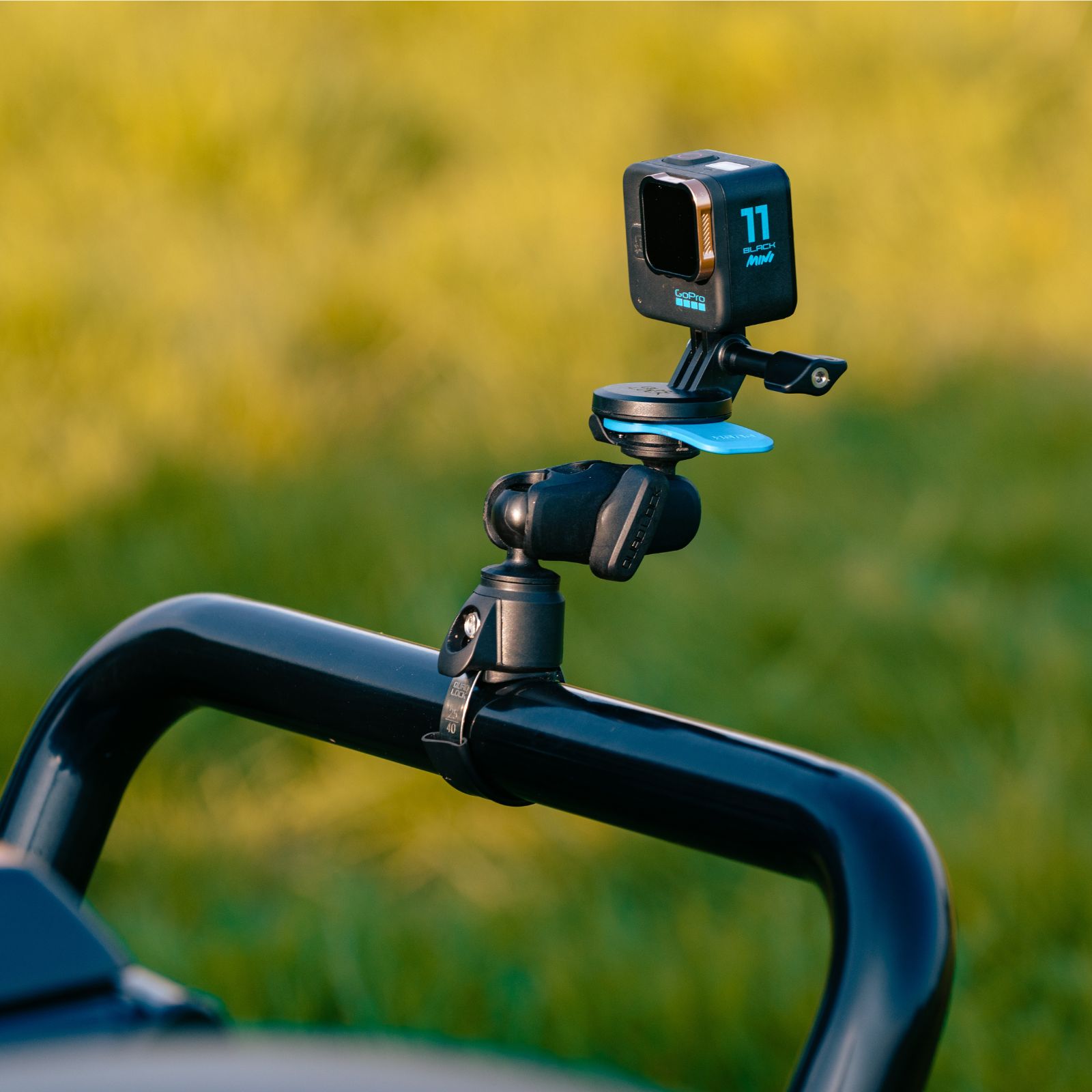 The Quad Lock 360 Base - Hose Clamp fits bars from 32mm to 60mm, allowing secure smartphone or action camera mounting on your vehicle's roll cage.
