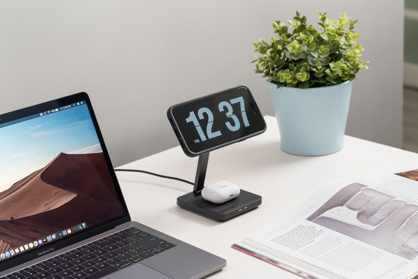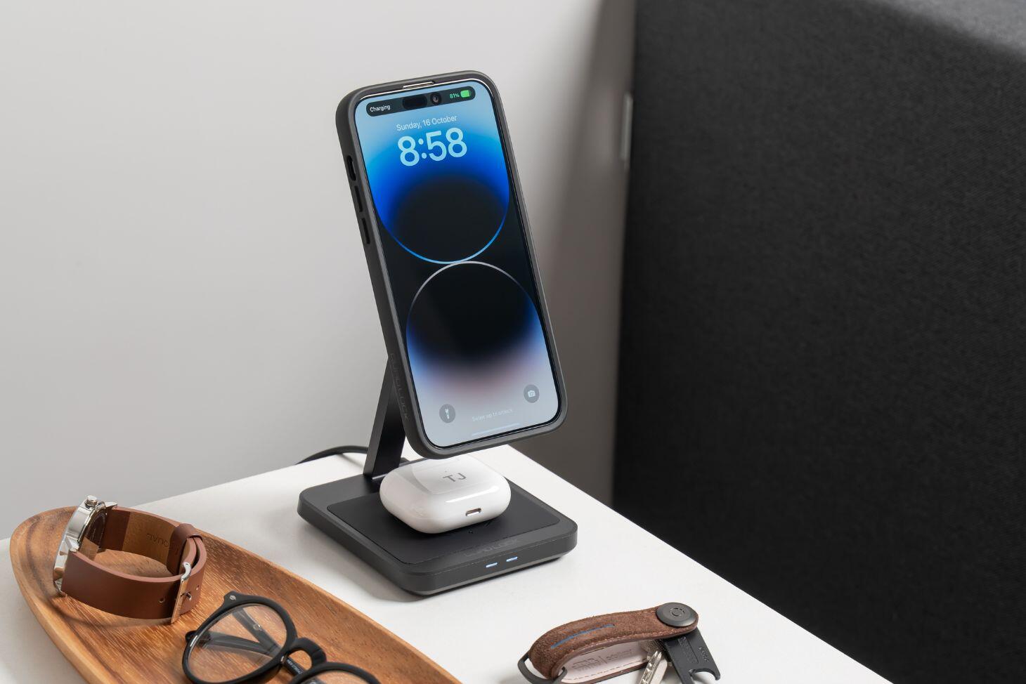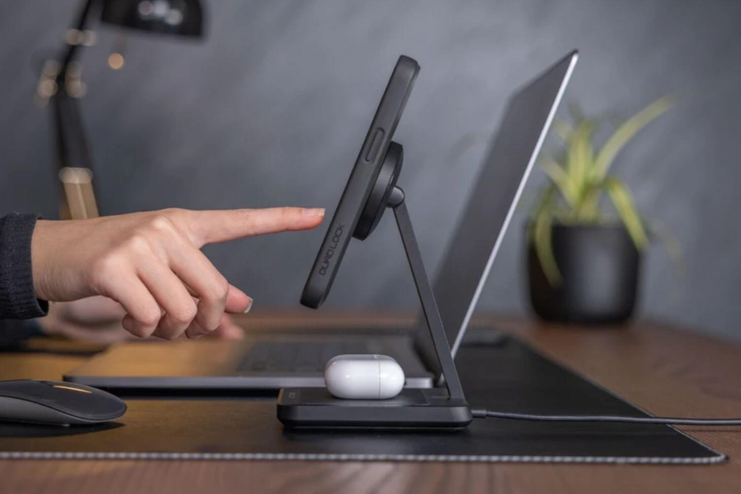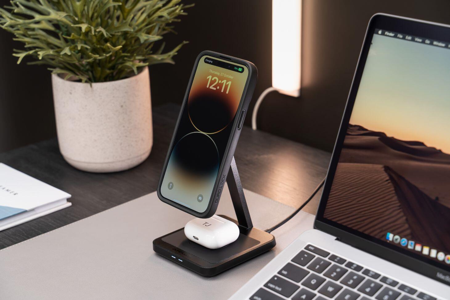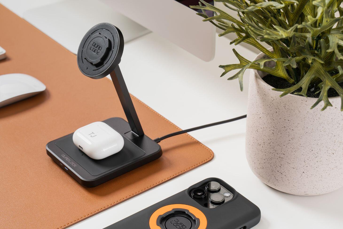 The Quad Lock® MAG Dual Desktop Wireless Charger offers fast and efficient charging for multiple devices, featuring a sleek design, adjustable viewing angles, and a secure nano-suction base.