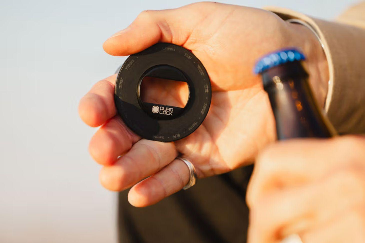 The Quad Lock MAG™ Phone Ring Grip/Stand/Bottle Opener, compatible with Quad Lock MAG™ Cases, provides a secure hold, kickstand functionality, and a bottle opener, all with 360-degree rotation.