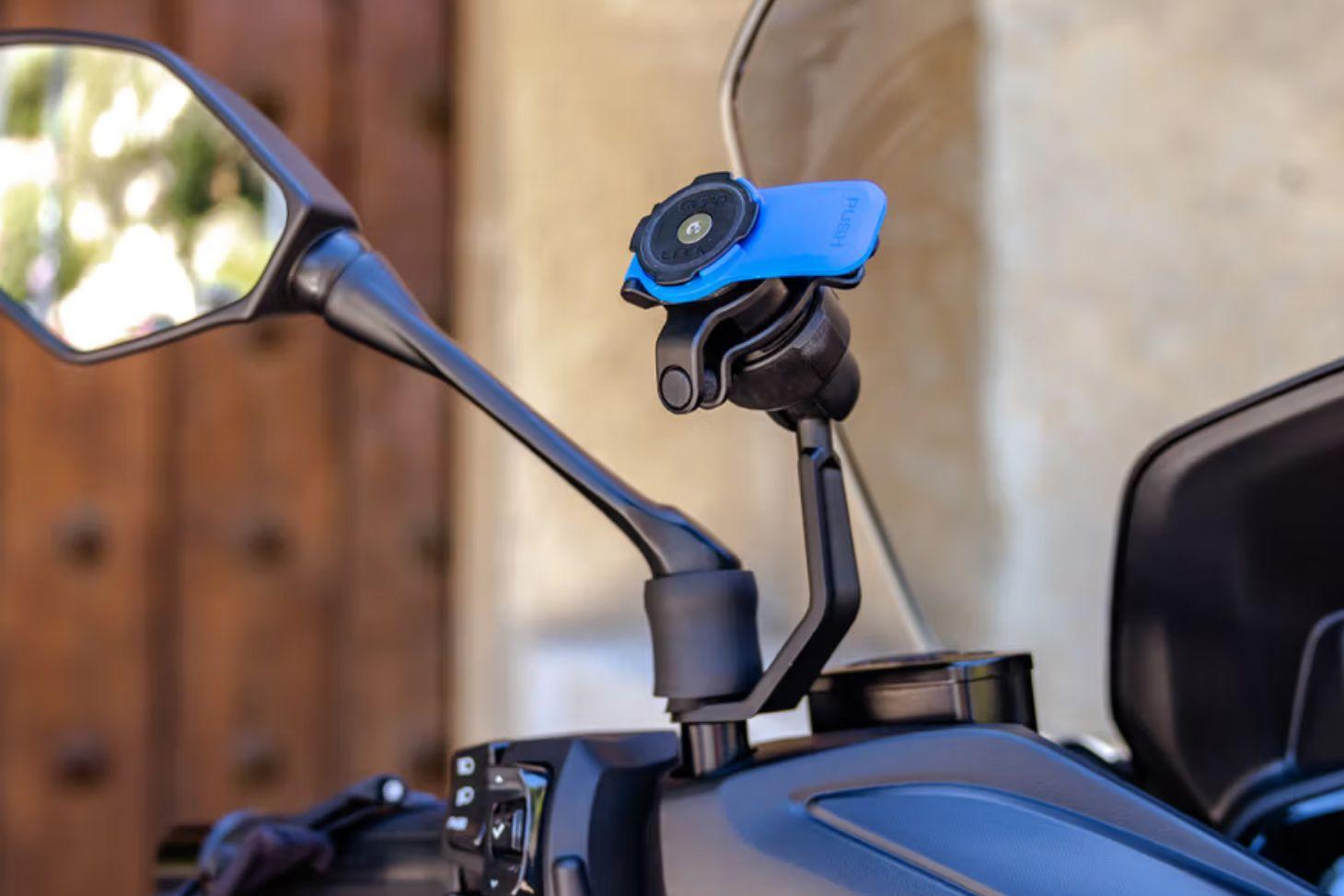 The Quad Lock® Mirror Stem Mount securely attaches your phone to your scooter or motorcycle, with an adjustable gimbal head, optimal viewing angle, and sleek design.