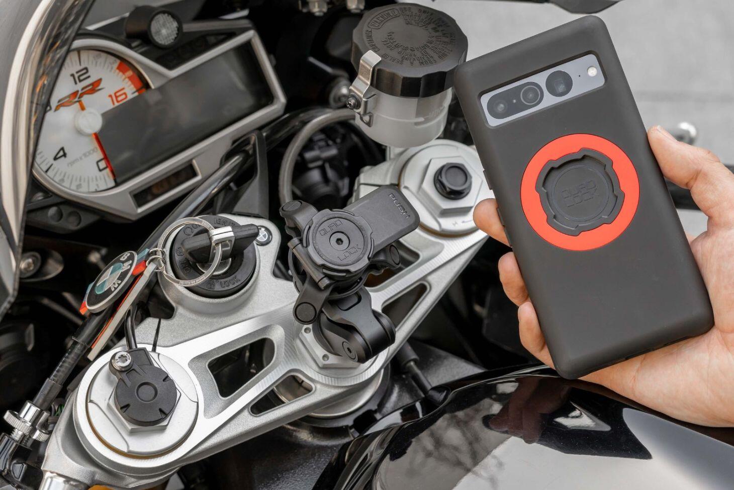 The Motorcycle Fork Stem Mount Pro by Quad Lock® offers a secure and sleek solution for mounting your smartphone. Made with high-quality materials and featuring a minimal design, this mount seamlessly integrates with your bike for a clean look.