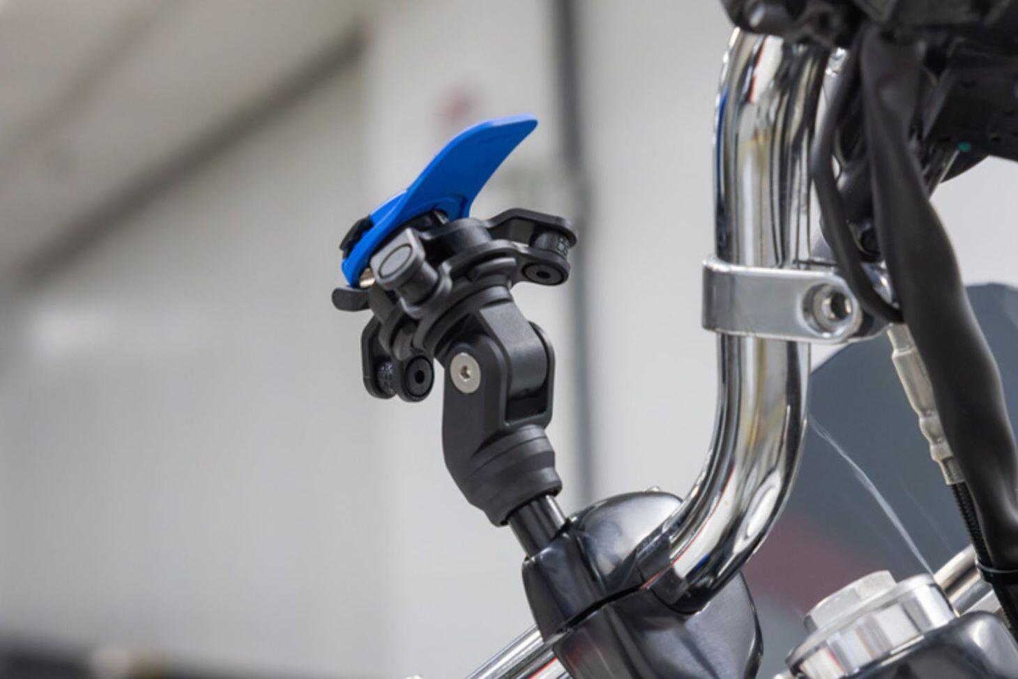 The Quad Lock® Handlebar Clamp Mounts replace an M8 bolt on your motorcycle handlebar clamp, offering adjustable viewing angles and secure, sleek integration.